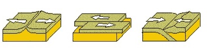 De ene schol glijdt langs de andere schol. Bijvoorbeeld de San Andreas-breuk in Californie.